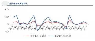 對比下圖中半導體和連接器從1994-2015 年二十年的發展,連接器行業的抗周期性不言自明。即使在 2009 年經濟萎縮時,連接器市場的下降幅度仍然小于同期的半導體行業萎縮規模。